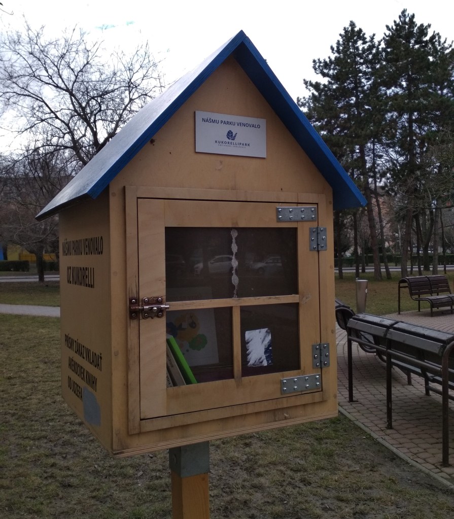 Druhej knižke som vybrala túto knižnú búdku pri fontánke v Kukorelliho parku v Bratislave.